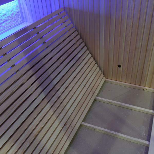 Основная часть корпуса выполнена из древесины хемлок (прочное дерево, по своим свойствам близкое канадской лиственнице). Большая область сауны представлена закаленным стеклом.