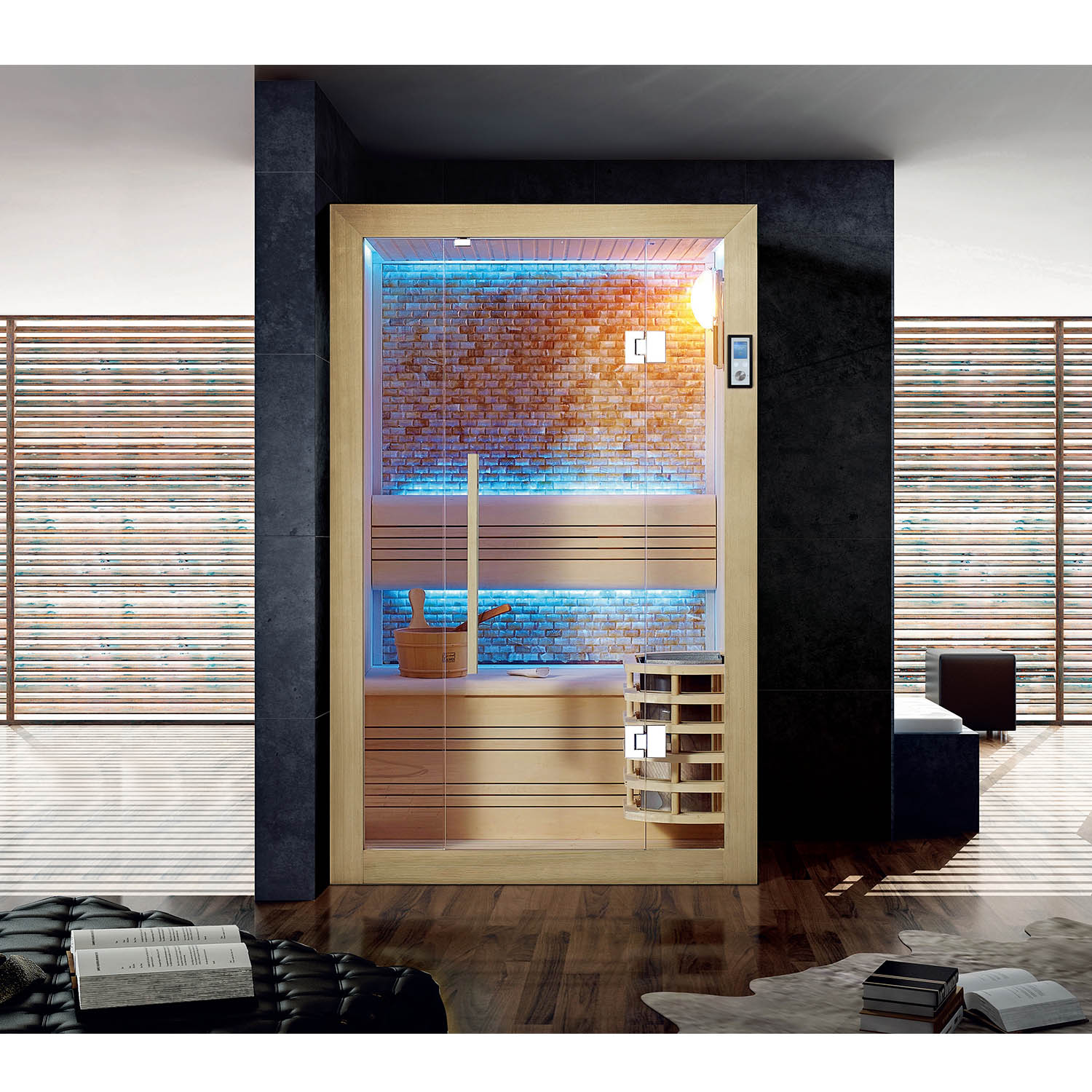 Компания Mexda предлагает на выбор клиентам различные многофункциональные системы управления и настройки сауны. Большинство саун оснащены Bluetooth, USB или FM. Кроме того, с помощью системы также можно регулировать температуру, цвет светодиодной лампы и время.