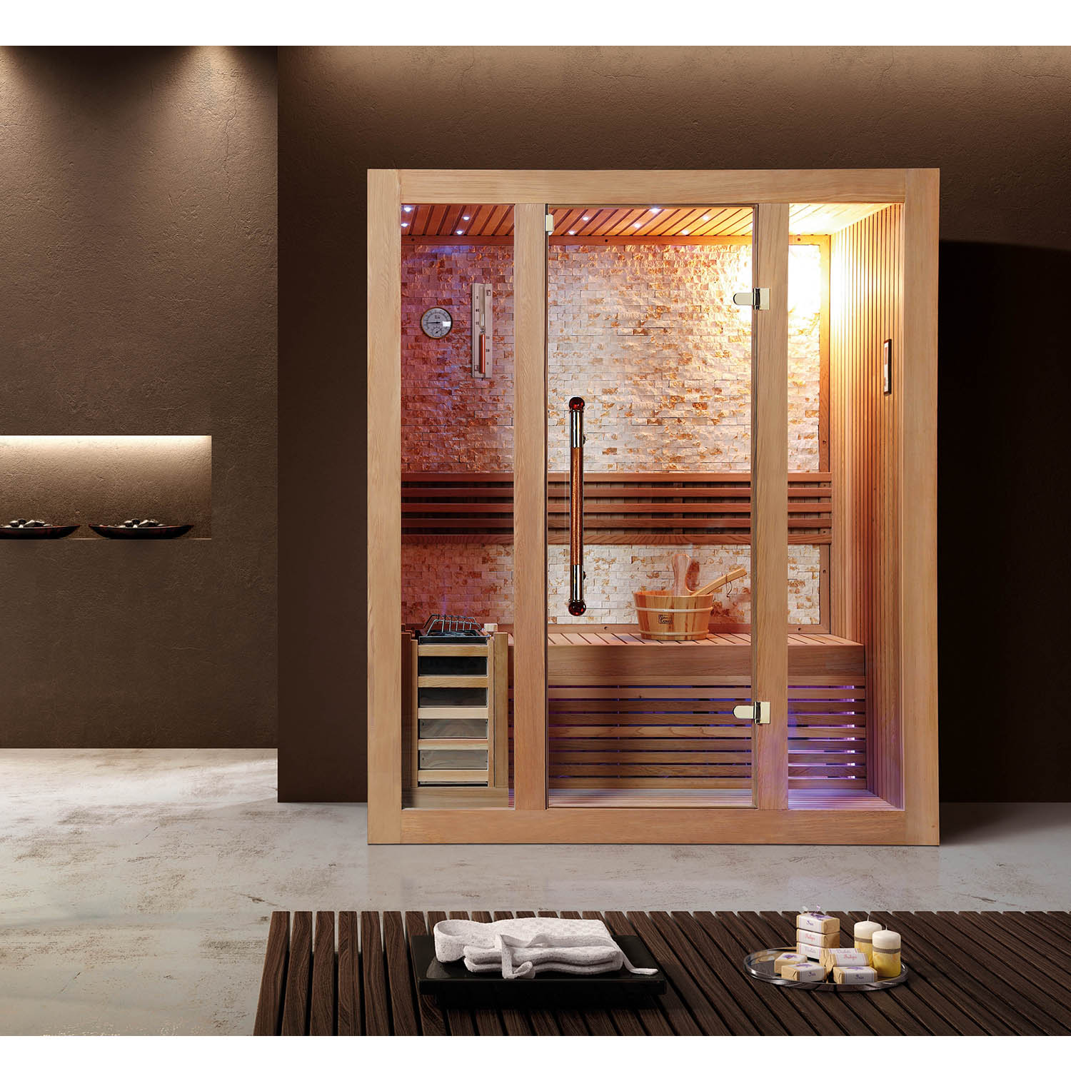 Внутри сауны используется светодиодное освещение. Цвет можно изменить на красный, зеленый, синий и градиент.