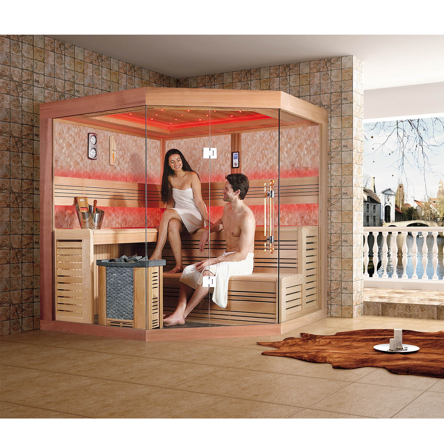 Внутри сауны используется светодиодное освещение. Цвет можно изменить на красный, зеленый, синий и градиент.