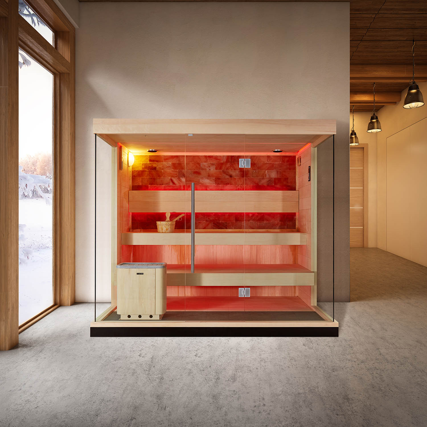 Внутри сауны используется светодиодное освещение. Цвет можно изменить на красный, зеленый, синий и градиент.