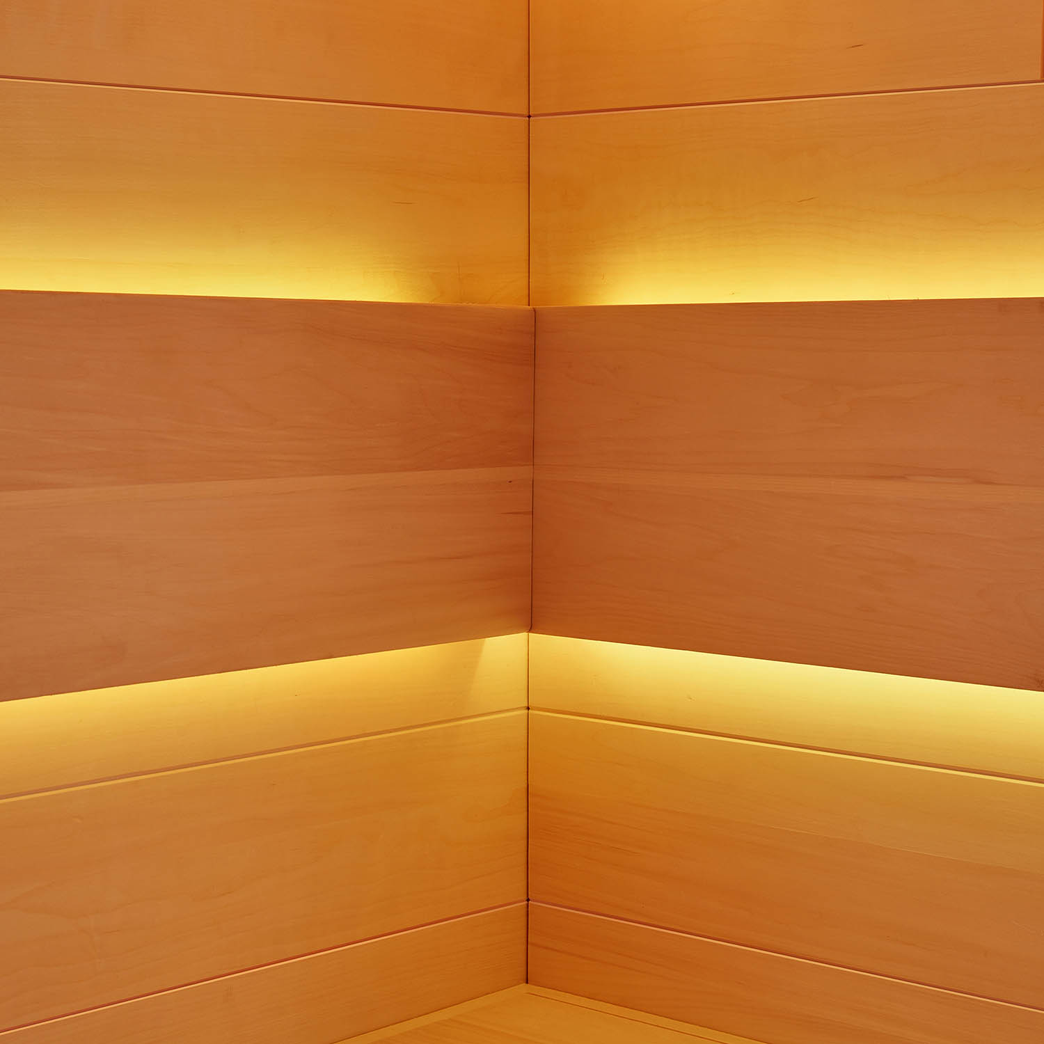 Внутри сауны используется светодиодное освещение. Цвет можно изменить на красный, зеленый, синий и градиент.
