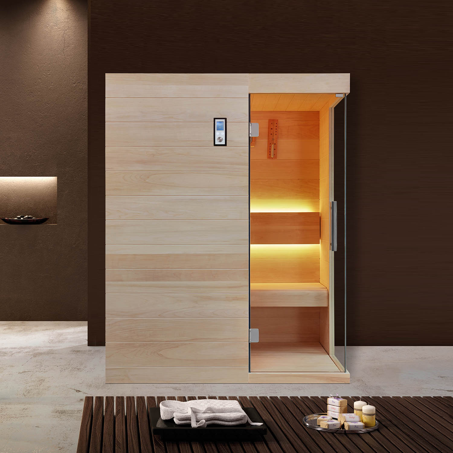 Компания Mexda предлагает на выбор клиентам различные многофункциональные системы управления и настройки сауны. Большинство саун оснащены Bluetooth, USB или FM. Кроме того, с помощью системы также можно регулировать температуру, цвет светодиодной лампы и время.