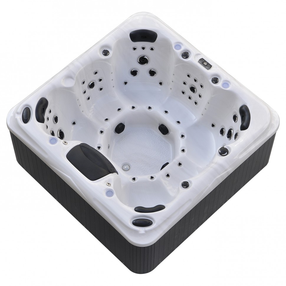Квадратный гидромассажный комплекс размером 2200×2200×970 мм создан специально для наслаждения водными процедурами на свежем воздухе, предлагая идеальное сочетание функциональности и устойчивости к внешним воздействиям.