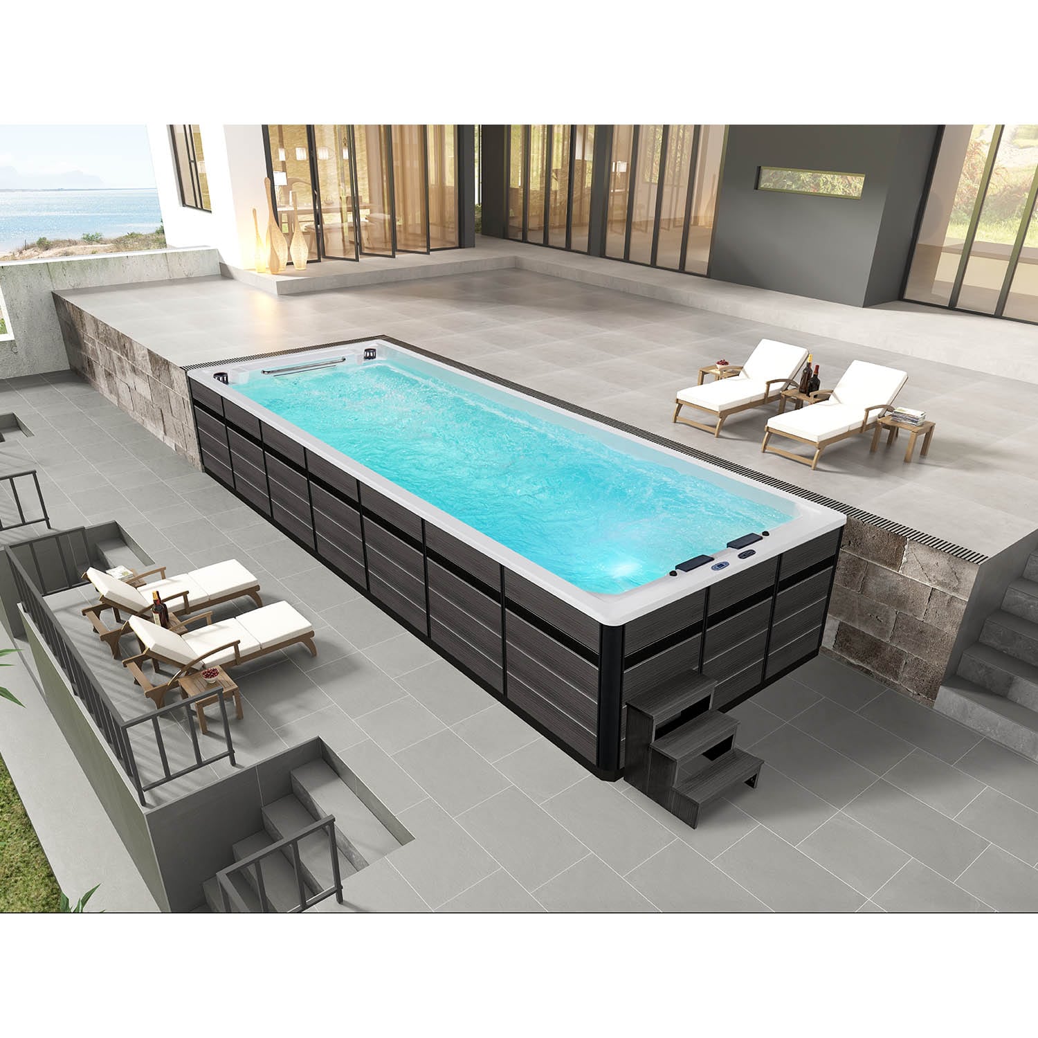 Данная модель бассейна компании Mexda имеет современное техническое оснащение, подходящее для наружной установки.