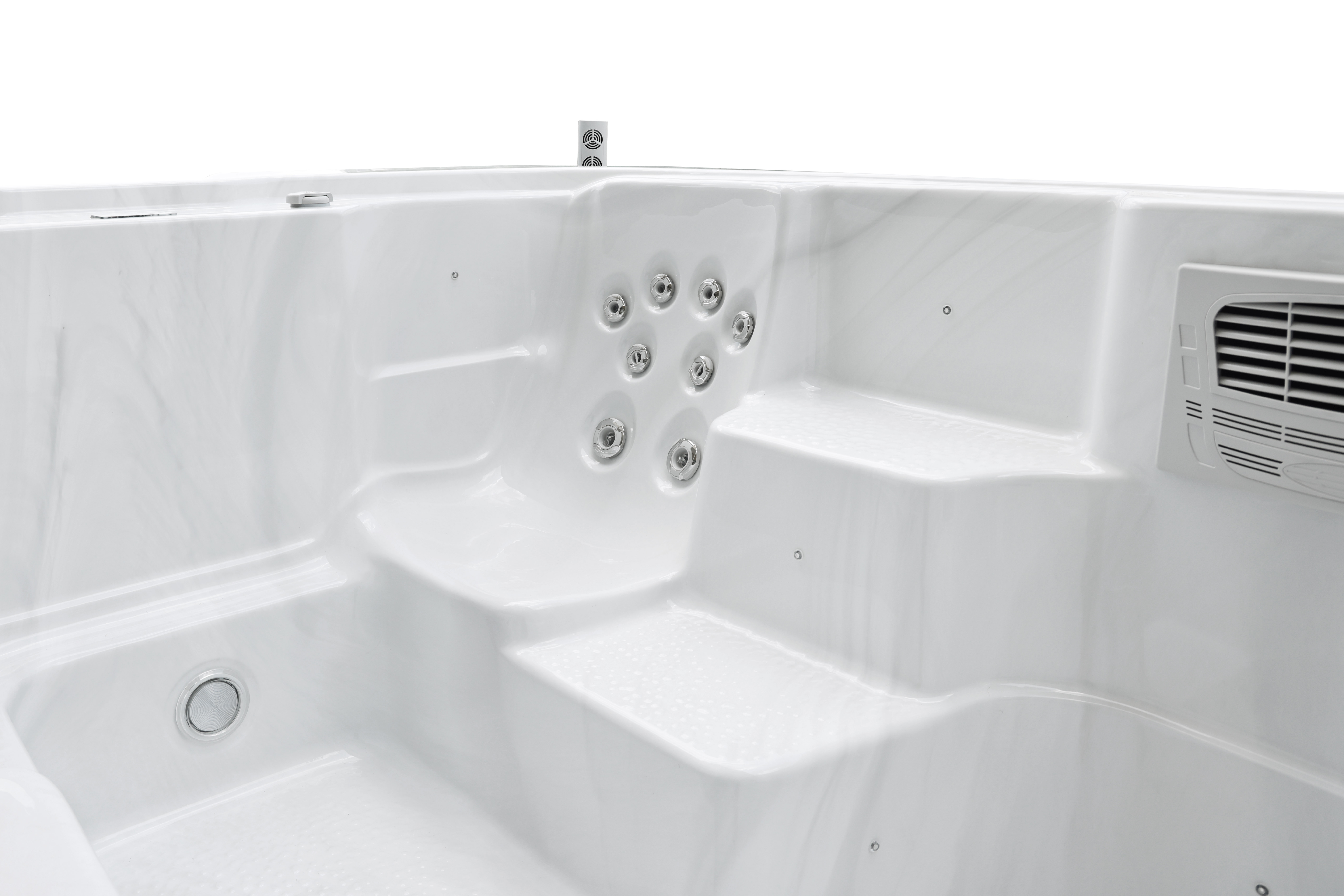 Прочное дно из fiberglass и спа-крышка обеспечивают долговечность конструкции, сохранение тепла и безопасность использования.